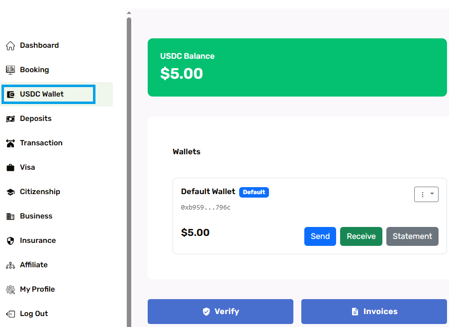 🔐 The Visadorm USDC Wallet is a secure, self‑custodial solution for managing USD Coin on‑chain.🧾 Create and manage multiple wallets (personal, business, escrow, or project). ⚡ Send and receive fast USDC payments via Base L2.🔗 Generate payment links and QR codes for clients (no bank required).🛡️ Use smart‑contract escrow for secure settlements. 📜 The wallet includes transaction history and can generate an official Verification Letter (timestamped balance on company letterhead) for visa, financial, or business purposes. 🔗 Built on Base (Coinbase) • 💵 Settlements in Circle USDC • 🛰️ Connectivity via Alchemy. 🗝️ You control private keys and seed phrases — Visadorm does not store or recover them. 📝 Back up your seed phrase, review confirmations before large transfers (gas fees are covered by Visadorm where indicated), and consider hardware wallets for high‑value holdings.